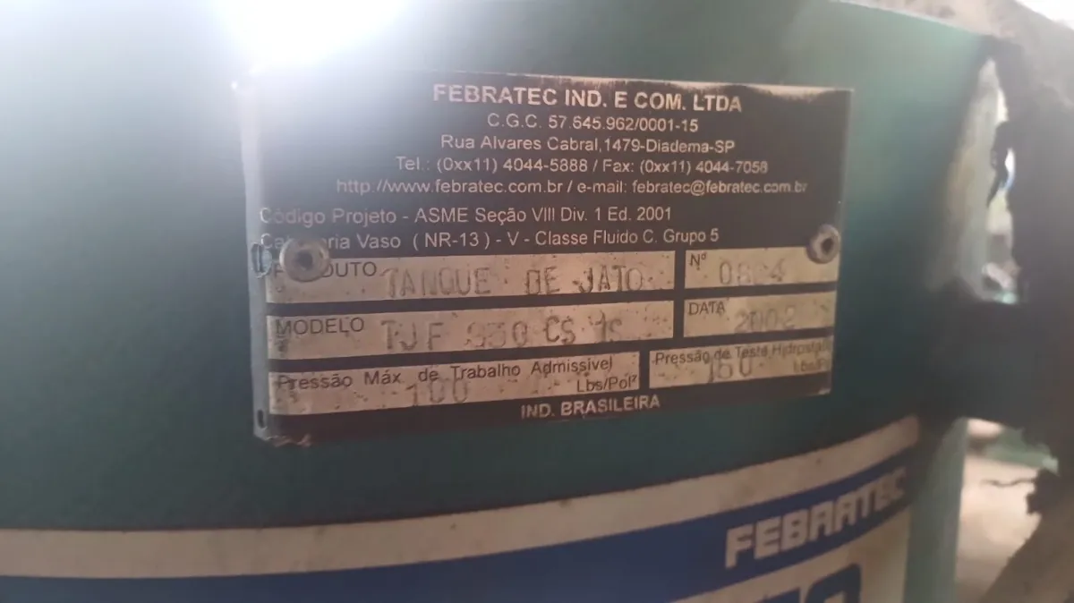 1-Modelo TJF Ano 2002: Este jato de areia é um modelo clássico da Tecjato, conhecido por sua durabilidade e eficiência. Fabricado no ano de 2002, ainda mantém sua qualidade e desempenho excepcionais.